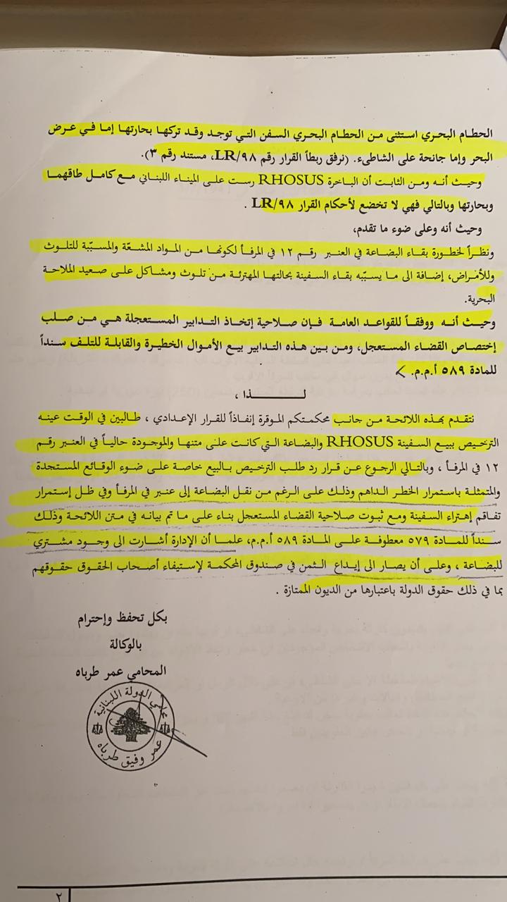 يتقدّم محامي الدولة بهذه اللائحة الى قضاء العجلة بطلب ترخيص بيع السفينة والبضاعة التي كانت على متنها والموجودة حاليا في العنبر 12 والرجوع عن قرار رد طلب ترخيص بالبيع خاصة أنّ الخطر مستمرّ على الرّغم من نقل البضاعة الى العنبر 12، ويلحظ أن الادارة أشارت الى وجود مشتري للبضاعة