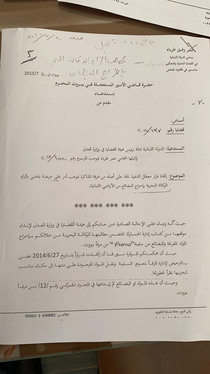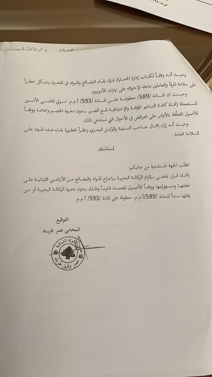 يشير محامي الدولة الى أنّ المواد باتت في العنبر 12 وأنّ إدارة الجمارك وفقا لكتابها تعتبر أنّ بقاء المواد في المخزن يشكّل خطرا على سلامة المرفأ والعاملين داخله لاحتوائه على نيترات الأمونيوم ويطلب من قاضي الأمور المستعجلة اتّخاذ قرار بالزام الوكالة البحرية بإخراج المواد والبضائع من الأراضي اللبنانية على نفقتها ومسؤوليتها
