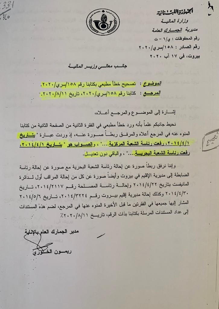 - The referral of the Customs Regional Directorate of Beirut, without number and dated August 10, 2020