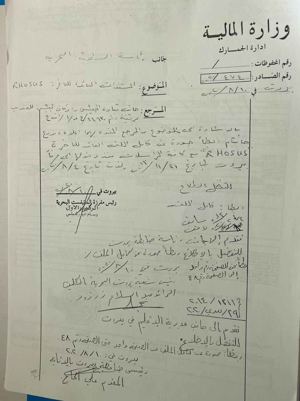- On March 4, 2014, the first controller of the Manifest Department sent a letter to the Port of Beirut Customs Service to inform the Service that the Brigades refused to receive the “call”, and accordingly the head of Service referred the letter to the Customs Regional Directorate of Beirut to ask the head of the Brigades to provide the information requested in the letter of the First Controller of the Manifest Department.